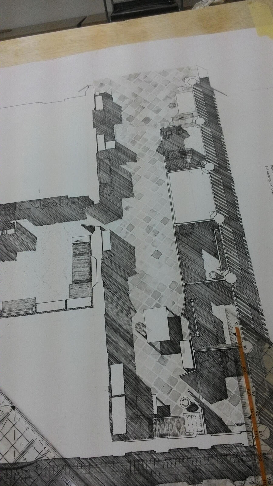Di studio temporer ini kami mulai melanjutka proses gambar, karena saya pribadi masih terus melengkapi gambar denah yang belum selesai dan dikerjakan selama ±4 hari. Baru setelah selesai dengan gambar menggunakan pensil kami lanjut menebalkan menggunakan pulpen.